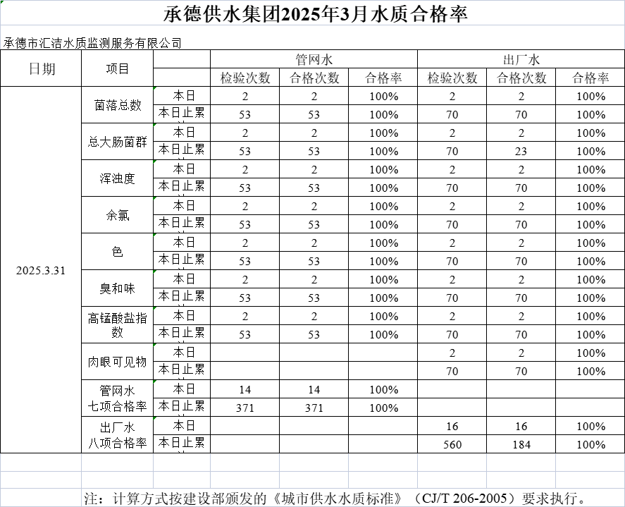 承德供水集團2025年3月31日水質合格率